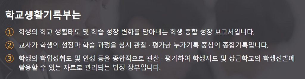 학교생활기록부는 ①학생의 학교 생활태도 및 학습 성장 변화를 담아내는 학생 종합 성장 보고서입니다. ②교사가 학생의 성장과 학습 과정을 상시 관찰, 평가한 누가기록 중심의 종합기록입니다. ③학생의 학업성취도 및 인성 등을 종합적으로 관찰, 평가하여 학생지도 및 상급학교의 학생선발에 활용할 수 있는 자료로 관리되는 법정 장부입니다.