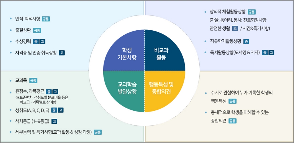 학생기록부에는 인적, 학적사항, 출결상황, 수상경력, 자격증 및 인증 취득상황, 체험활동상황, 독서활동상황, 석차등급과 수시로 관찰하여 누가 기록한 학생의 행동특성, 총제적으로 학생을 이해할 수 있는 종합의견 등이 기재가 됩니다.