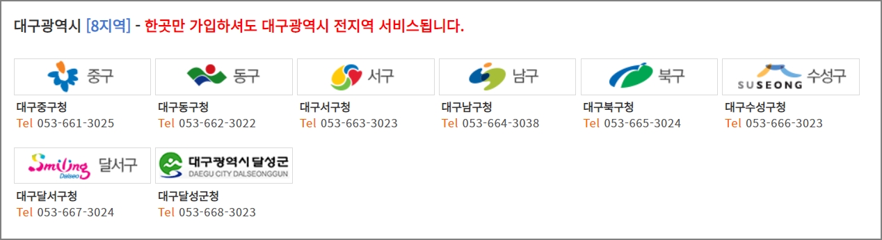 대구는 한곳만 가입해도 대구광역시 전지역 서비스가 됩니다. 중구, 동구, 서구, 남구, 북구, 수성구, 달서구, 달성군 모두 한번에 이용가능합니다. https://parkingsms.daegu.go.kr/