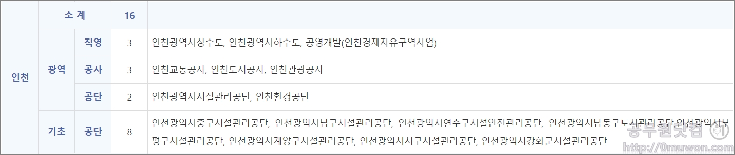 인천광역시상수도, 인천광역시하수도, 공영개발(인천경제자유구역사업), 인천교통공사, 인천도시공사, 인천관광공사, 인천광역시시설관리공단, 인천환경공단, 인천광역시중구시설관리공단, 인천광역시남구시설관리공단, 인천광역시연수구시설안전관리공단, 인천광역시남동구도시관리공단,인천광역시부평구시설관리공단, 인천광역시계양구시설관리공단, 인천광역시서구시설관리공단, 인천광역시강화군시설관리공단