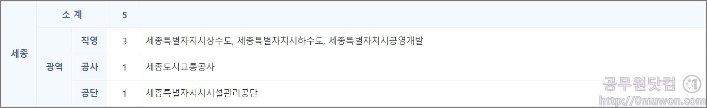 세종특별자치시상수도, 세종특별자치시하수도, 세종특별자치시공영개발, 세종도시교통공사, 세종특별자치시시설관리공단