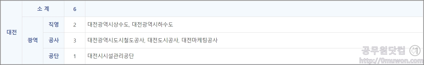 대전광역시상수도, 대전광역시하수도, 대전광역시도시철도공사, 대전도시공사, 대전마케팅공사, 대전시시설관리공단