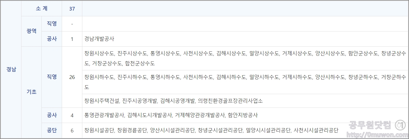 경남개발공사, 창원시상수도, 진주시상수도, 통영시상수도, 사천시상수도, 김해시상수도, 밀양시상수도, 거제시상수도, 양산시상수도, 함안군상수도, 창녕군상수도, 거창군상수도, 합천군상수도, 창원시하수도, 진주시하수도, 통영시하수도, 사천시하수도, 김해시하수도, 밀양시하수도, 거제시하수도, 양산시하수도, 창녕군하수도, 거창군하수도 창원시주택건설, 진주시공영개발, 김해시공영개발, 의령친환경골프장관리사업소, 통영관광개발공사, 김해시도시개발공사, 거제해양관광개발공사, 함안지방공사, 창원시설공단, 창원경륜공단, 양산시시설관리공단, 창녕군시설관리공단, 밀양시시설관리공단, 사천시시설관리공단