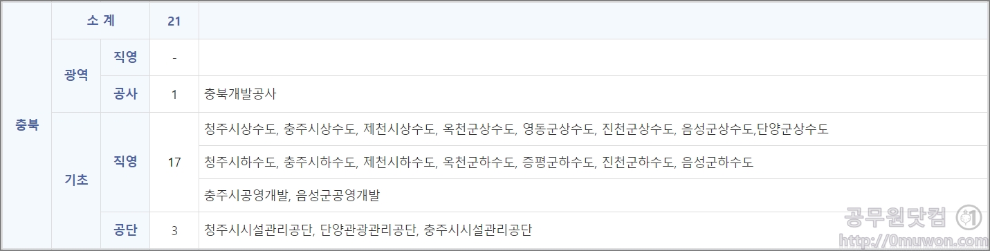 충북개발공사, 청주시상수도, 충주시상수도, 제천시상수도, 옥천군상수도, 영동군상수도, 진천군상수도, 음성군상수도, 단양군상수도, 청주시하수도, 충주시하수도, 제천시하수도, 옥천군하수도, 증평군하수도, 진천군하수도, 음성군하수도, 충주시공영개발, 음성군공영개발, 청주시시설관리공단, 단양관광관리공단, 충주시시설관리공단