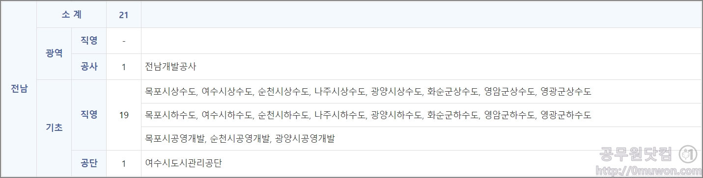 전남개발공사, 목포시상수도, 여수시상수도, 순천시상수도, 나주시상수도, 광양시상수도, 화순군상수도, 영암군상수도, 영광군상수도 목포시하수도, 여수시하수도, 순천시하수도, 나주시하수도, 광양시하수도, 화순군하수도, 영암군하수도, 영광군하수도, 목포시공영개발, 순천시공영개발, 광양시공영개발, 여수시도시관리공단