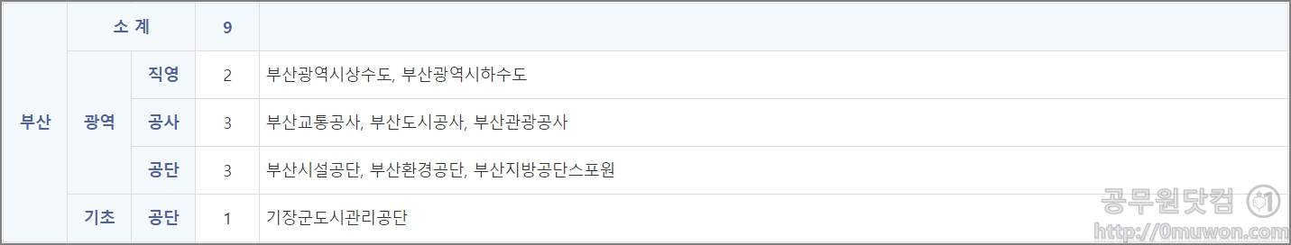 부산광역시상수도, 부산광역시하수도, 부산교통공사, 부산도시공사, 부산관광공사, 부산시설공단, 부산환경공단, 부산지방공단스포원, 기장군도시관리공단