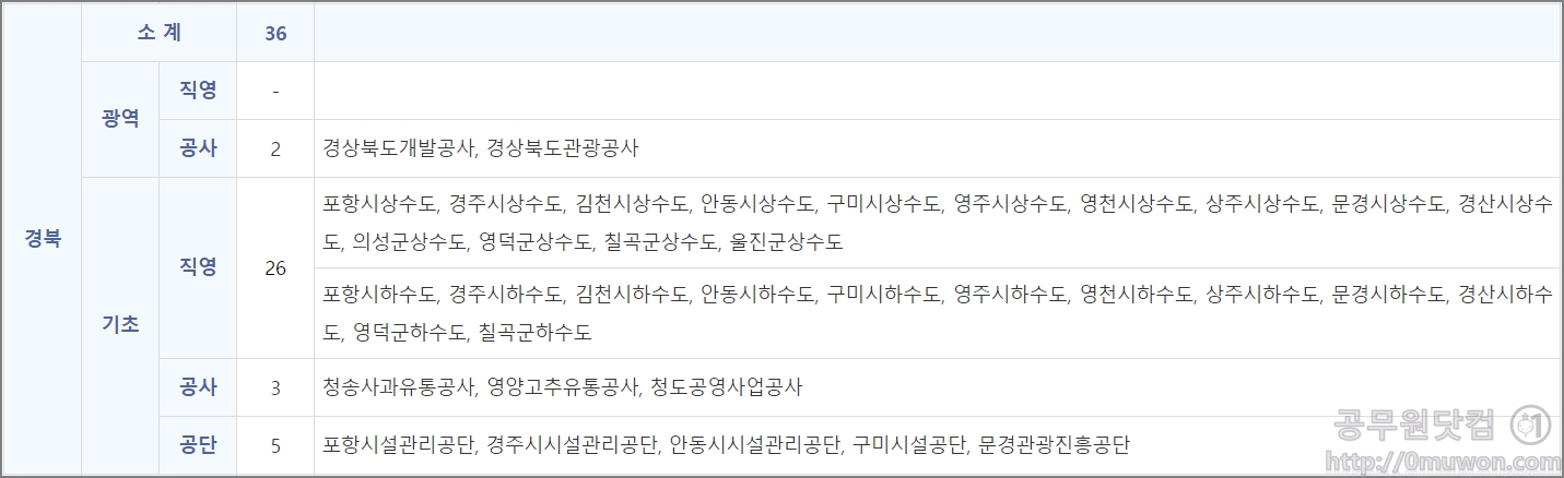 경상북도개발공사, 경상북도관광공사, 포항시상수도, 경주시상수도, 김천시상수도, 안동시상수도, 구미시상수도, 영주시상수도, 영천시상수도, 상주시상수도, 문경시상수도, 경산시상수도, 의성군상수도, 영덕군상수도, 칠곡군상수도, 울진군상수도, 포항시하수도, 경주시하수도, 김천시하수도, 안동시하수도, 구미시하수도, 영주시하수도, 영천시하수도, 상주시하수도, 문경시하수도, 경산시하수도, 영덕군하수도, 칠곡군하수도, 청송사과유통공사, 영양고추유통공사, 청도공영사업공사, 포항시설관리공단, 경주시시설관리공단, 안동시시설관리공단, 구미시설공단, 문경관광진흥공단
