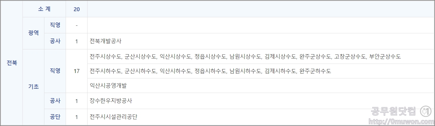전북개발공사, 전주시상수도, 군산시상수도, 익산시상수도, 정읍시상수도, 남원시상수도, 김제시상수도, 완주군상수도, 고창군상수도, 부안군상수도, 전주시하수도, 군산시하수도, 익산시하수도, 정읍시하수도, 남원시하수도, 김제시하수도, 완주군하수도 익산시공영개발, 장수한우지방공사, 전주시시설관리공단