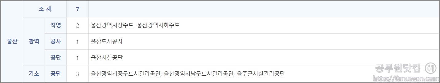 울산광역시상수도, 울산광역시하수도, 울산도시공사, 울산시설공단, 울산광역시중구도시관리공단, 울산광역시남구도시관리공단, 울주군시설관리공단