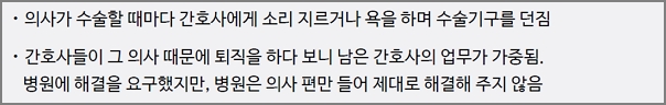 의사가 수술할 때마다 간호사에게 소리 지르거나 욕을 하며 수술기구를 던짐에 따라 간호사들이 그 의사 때문에 퇴직을 하다 보니 남은 간호사의 업무가 가중되었음. 병원에 해결을 요구했지만, 병원은 의사 편만 들어 제대로 해결해 주지 않는 행위.