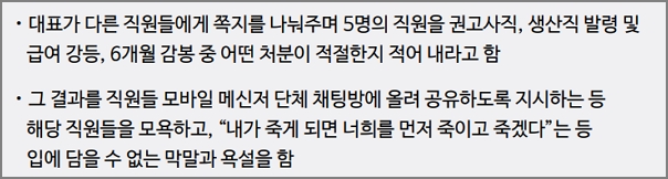 대표가 다른 직원들에게 쪽지를 나눠주며 5명의 직원을 권고사직, 생산직 발령 및 급여 강등, 6개월 감봉 중 어떤 처분이 적절한지 적어 내라고 하였습니다. 그 결과를 직원들 모바일 메신저 단체 채팅방에 올려 공유하도록 지시하는 등 해당 직원들을 모욕하고, “내가 죽게 되면 너희를 먼저 죽이고 죽겠다”는 등 입에 담을 수 없는 막말과 욕설을 함.