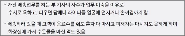 가전 배송업무를 하는 부 기사의 사수가 업무 미숙을 이유로 수시로 욕하고, 피우던 담배나 라이터를 얼굴에 던지거나 손찌검까지 하며, 배송하러 갔을 때 고객이 음료수를 줘도 혼자 다 마시고 피해자는 마시지도 못하게 하여 화장실에 가서 수돗물을 마신 적도 있음.