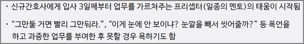 신규간호사에게 입사 3일째부터 업무를 가르쳐주는 프리셉터(일종의 멘토)의 태움이 시작되었음. “그만둘 거면 빨리 그만둬라.”, “이게 눈에 안 보이냐? 눈깔을 빼서 씻어줄까?” 등 폭언을 하고 과중한 업무를 부여한 후 못할 경우 욕하기도 함.