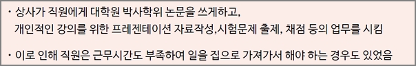 상사가 직원에게 대학원 박사학위 논문을 쓰게하고, 개인적인 강의를 위한 프레젠테이션 자료작성, 시험문제출제, 채점등의 업무를 시킴. 이로인해 직원은 근무시간도 부족하여 일을 집으로 가져가서 해야 하는 경우도 있었음.