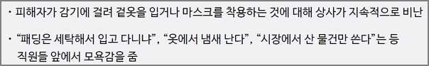 피해자가 감기에 걸려 겉옷을 입거나 마스크를 착용하는 것에 대해 상사가 지속적으로 비난하고, “패딩은 세탁해서 입고 다니냐”, “옷에서 냄새 난다”, “시장에서 산 물건만 쓴다”는 등 직원들 앞에서 모욕감을 주는 행위.