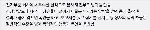 전자부품 회사에서 우수한 실적으로 본사 영업부로 발탁될 만큼 인정받았으나 시장 내 점유율이 떨어지자 회복시키라는 압박을 받던 중에 출장 후 결과가 좋지 않으면 폭언을 하고, 보고서를 찢고 집기를 던지는 등 상사의 실적 추궁은 일반적인 수준을 넘어 폭력적인 행동과 폭언을 동반함.