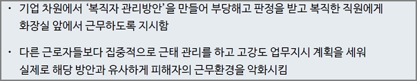 기업 차원에서 ‘복직자관리방안’을 만들어 부당해고 판정을 받고 복직한 직원에게 화장실앞에서 근무하도록 지시함. 다른 근로자들보다 집중적으로 근태관리를 하고 고강도 업무지시 계획을 세워 실제로 해당 방안과유사하게 피해자의 근무환경을 악화시킴.