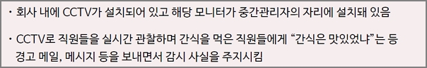 회사 내에 CCTV가 설치되어 있고 해당모니터가 중간관리자의 자리에 설치돼 있음. CCTV로 직원들을 실시간 관찰하며 간식을 먹은 직원들에게 “간식은 맛있었냐”는 등 경고메일, 메시지등을 보내면서 감시사실을 주지시킴.