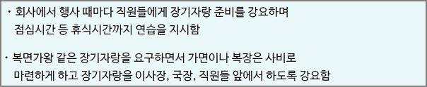 회사에서 행사 때마다 직원들에게 장기자랑 준비를 강요하며 점심시간 등 휴식시간까지연습을 지시하고, 복면가왕 같은장기자랑을 요구하면서 가면이나 복장은 사비로 마련하게 하고 장기자랑을 이사장, 국장, 직원들 앞에서 하도록 강요함.