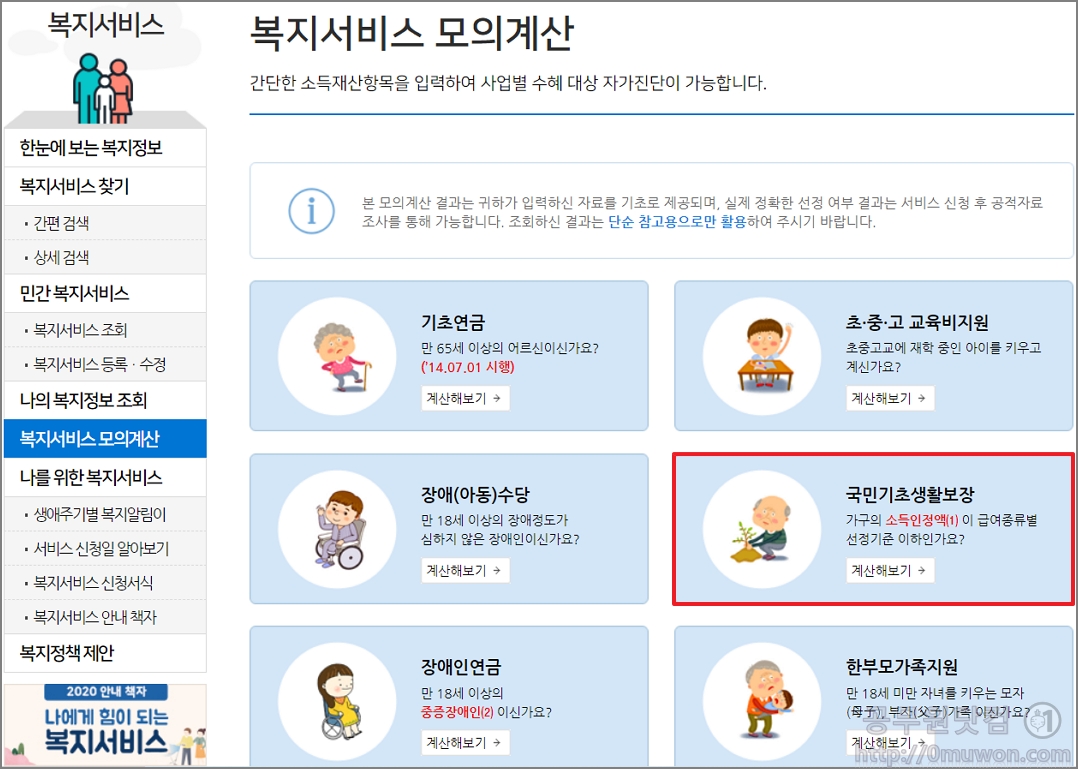 '국민기초생활보장 > 가구의 소득인정액이 급여종류별 선정기준 이하인가요?' 계산해보기를 클릭하세요. 모의계산이므로 단순참고용으로만 활용하시기 바랍니다.