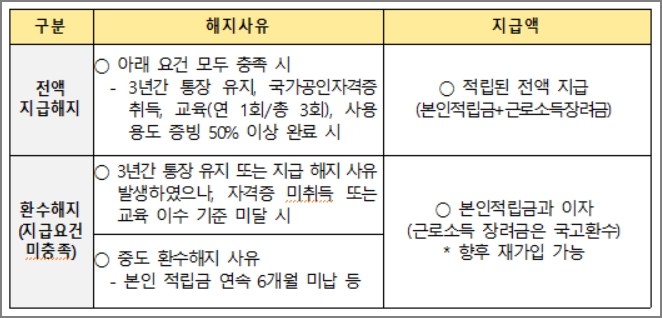 3년간 통장 유지 또는 지급 해지 사유가 발생하였으나, 자격증 미취득 또는 교육 3회를 받지 못한 경우, 본인 적립금 10만원을 연속 6개월 미납하는 경우에는 본인 적립금과 이자만 받을 수 있습니다. 향후에 재가입은 가능합니다.