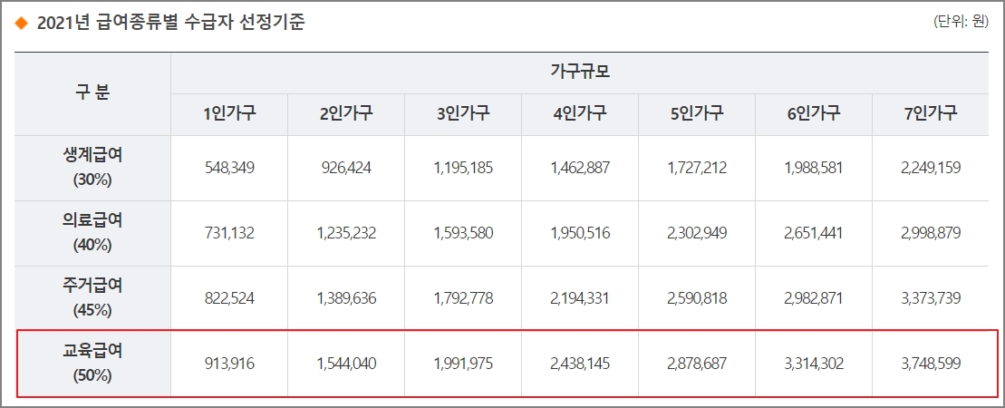 2021년 기준중위소득 50%는 1인 가구는 월 913,916원, 2인가구는 월 1,544,040원, 3인 가구는 월 1,991,975원, 4인 가구는 2,438,145원입니다.