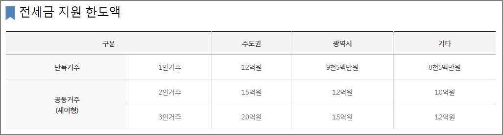 단독거주의 경우 수도권은 1.2억원, 광역시는 9천5백만원, 그 외의 지역은 8천5백만원입니다. 공동거주하는 경우 2인거주와 3인거주가 차이가 있습니다.