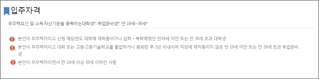①본인이 무주택자이고 신청 해당연도 대학에 재학중이거나 입학, 복학예정인 만19세 미만 또는 만39세 초과 대학생