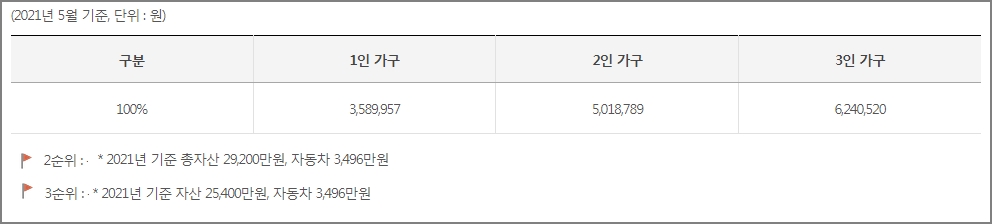 2인 거주는 수도권 1.5억원, 광역시 1.2억원, 그외는 1억원입니다. 3인 거주의 경우는 수도권, 광역시, 그외 각각 2억원, 1.5억원. 1.2억원입니다.