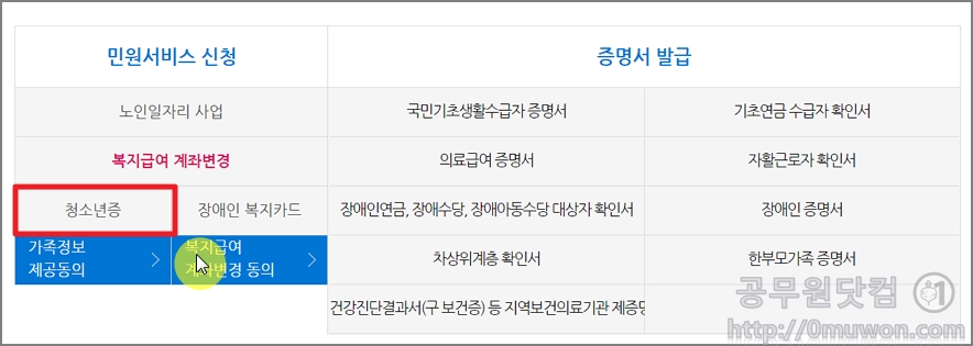 2. 민원서비스 신청에서 '청소년증' 을 클릭합니다.