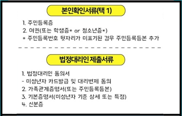 청소년 본인 확인서류 1가지가 필요합니다. 주민등록증, 여권, 학생증, 청소년증이 있으면 됩니다. 학생증 등에 주민등록번호 뒷자리가 없는 경우는 주민등록등본이 추가로 필요합니다. 주민등록등본을 무료로 발급 받는 법을 참고하세요. <주민등록등본, 주민등록초본 무료로 발급 받기>