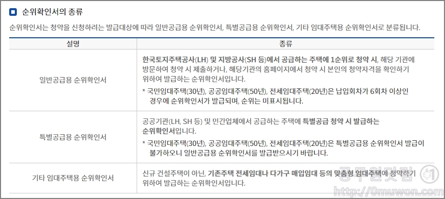 순위확인서는 청약을 신청하려는 발급대상에 따라 일반공급용, 순위확인서, 특별공급용 순위확인서, 기타 임대주택용 순위확인서로 분류가 됩니다.