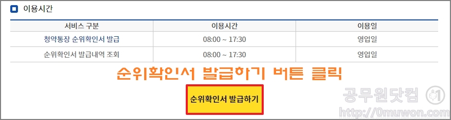 ▼ 청약통장 순위확인서 발급하기를 클릭합니다. 청약통장 순위확인서 발급은 영업일 오전 8시부터 오후 5시 30분까지만 가능합니다.