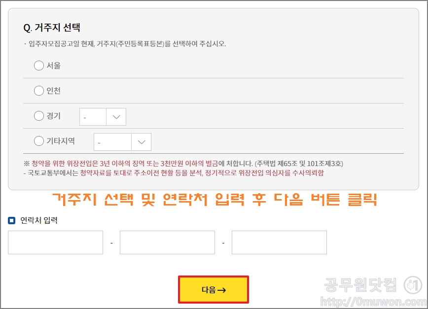 ▼ 거주지를 선택하고 연락처를 입력합니다. 거주지는 입주자모집공고일 현재 거주지(주민등록표등본)로 선택합니다. 청약을 위한 위장전입은 3년 이하의 징역 또는 3천만원 이하의 벌금에 처합니다. 청약자료를 토대로 주소이전 현황 등을 분석하여, 정기적으로 위장전입 의심자를 수사의뢰하고 있습니다.