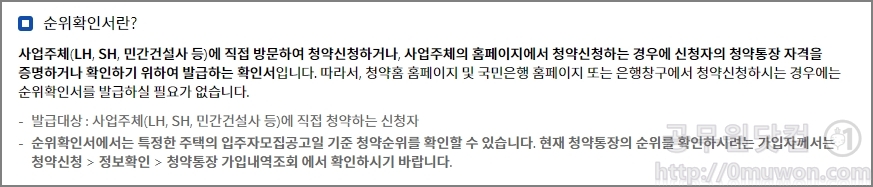 사업주체(LH, SH, 민간건설사 등)에 직접 방문하여 청약신청하거나, 사업주체의 홈페이지에서 청약신청하는 경우에 신청자의 청약통장 자격을 증명하거나 확인하기 위하여 발급하는 확인서입니다. 따라서, 청약홈 홈페이지 및 국민은행 홈페이지 또는 은행창구에서 청약신청하시는 경우에는 순위확인서를 발급하실 필요가 없습니다.