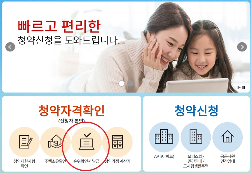 ▼ 청약홈에서 순위확인서 메뉴를 클릭합니다.