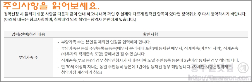 무주택기간 및 부양가족수는 정확하게 선택을 하여야 합니다. 허위 또는 부정확하게 입력하는 경우 부적격 처리가 됩니다.