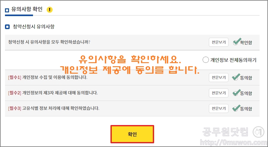 4. 청약신청 시 유의사항을 확인합니다. 개인정보 수집 및 제공에 동의 체크 후 확인 버튼을 클릭합니다.