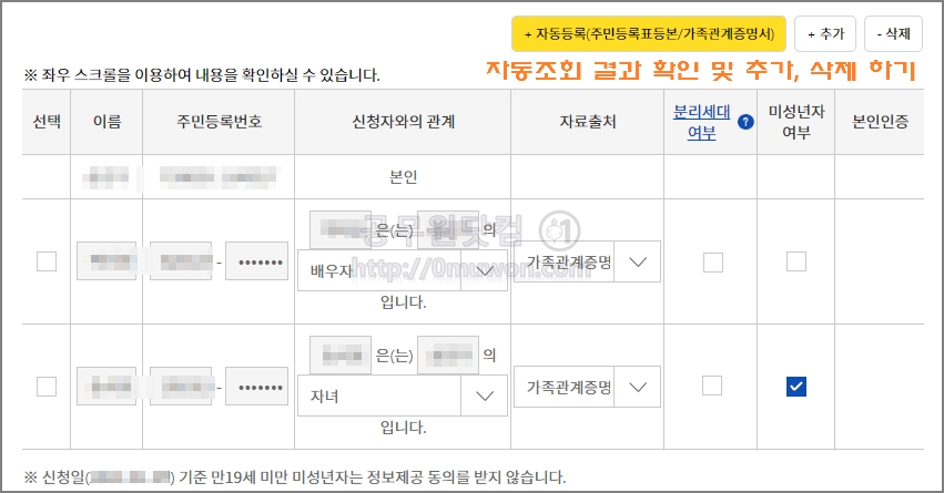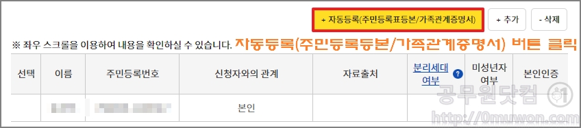 1. 자동등록(주민등록등본/가족관계증명서) 버튼 클릭합니다. 그러면 자동으로 입력이 됩니다. 자동으로 입력하지 않으려는 분들은 +추가, -삭제 버튼을 이용하여 세대구성원을 등록하거나 삭제하면 됩니다.