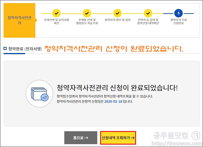 18. 드디어 청약자격사전관리 신청이 완료되었습니다. 청약접수일까지 청약사전관리 청약신청 내역조회가 가능합니다.