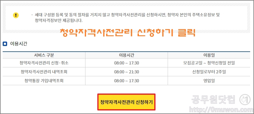 2. 이용시간 내에만 신청이 가능합니다. 이용시간을 확인하세요. 청약자격사전관리 신청하기 버튼을 클릭합니다.