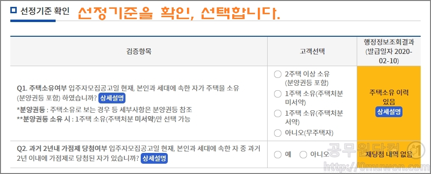 12. 선정기준을 확인합니다. 행정정보조회결과를 참고하여 검증항목을 선택합니다. 2주택 이상 소유(분양권등 포함), 1주택 소유(주택처분 미서약), 1주택 소유(주택처분 서약), 무주택자 중 선택을 하면 됩니다. 과거 2년내 가점제 당첨여부를 선택합니다.