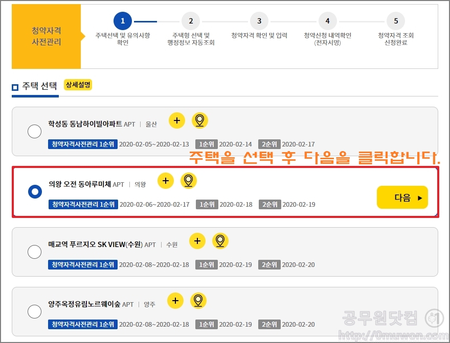 3. 사전자격신청이 가능한 주택 리스트가 나옵니다. 여기에서 청약자격사전관리를 신청할 주택을 선택 후 다음을 클릭합니다.