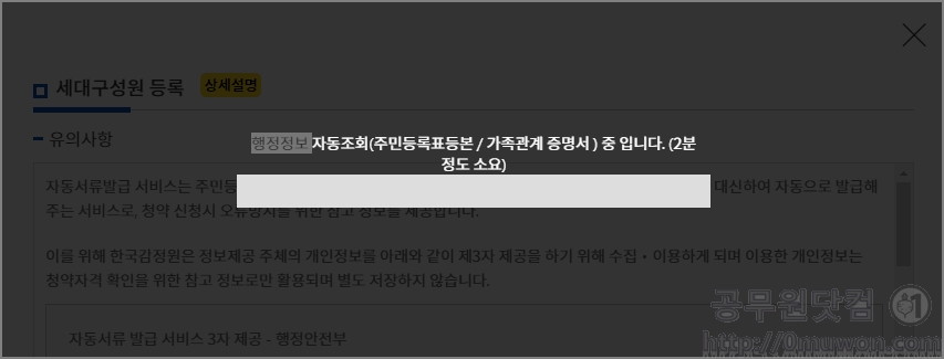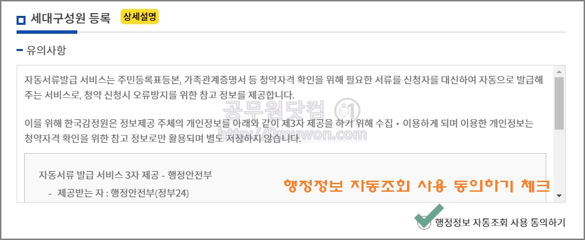 2. 세대구성원 등록을 위해 행정정보 자동조회 동의하기에 체크를 합니다. 자동서류발급 서비스는 주민등록표등본, 가족관계증명서 등 청약자격 확인을 위해 필요한 서류를 신청자를 대신하여 자동으로 발급해 주는 서비스로, 청약 신청시 오류방지를 위한 참고 정보를 제공합니다.