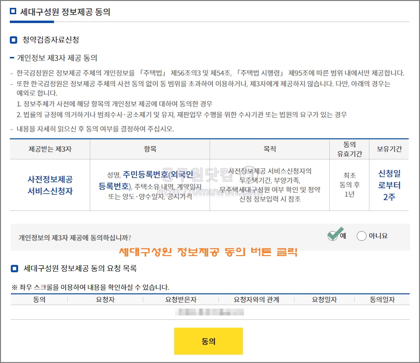 2. 세대구성원 정보제공 동의 요청 목록을 확인 후 동의 버튼을 클릭합니다. 그러면 자동으로 위에서 세대원등록에 자동으로 인증이 완료됩니다. 동의 후 다시 취소도 가능합니다. 동의 한 상태에서는 '취소' 버튼이 보입니다. 취소버튼을 누르면 바로 동의가 취소됩니다.