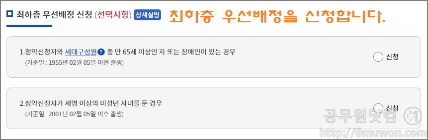 16. 최하층 우선배정을 신청합니다. 선택사항입니다. 해당하는 경우만 신청을 하면 됩니다. 청약신청자와 세대구성원 중 만65세 이상인 자 또는 장애인이 있는 경우, 청약신청자가 세명 이상의 미성년 자녀를 둔 경우 신청을 하면 됩니다.