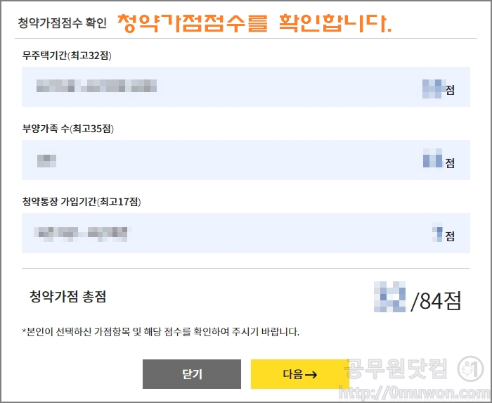 14. 본인이 선택한 가점항목 및 청약가점점수를 확인합니다. 무주택기간은 최고 32점, 부양가족수는 최고35점, 청약통장 가입기간은 최고 17점입니다.