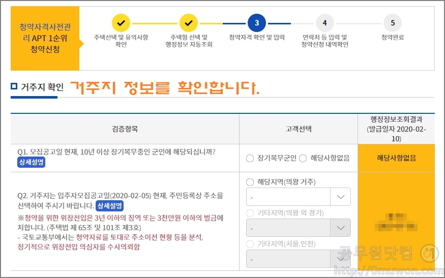 11. 행정정보조회결과를 참고하여 거주지 정보를 확인 및 선택합니다. 거주지는 입주자모집공고일 현재 주민등록상 주소를 선택하면 됩니다. 청약을 위한 위장전입은 3년 이하의 징역 또는 3천만원 이하의 벌금에 처합니다.