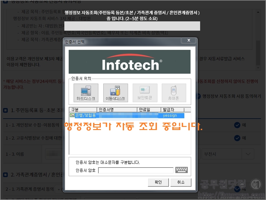 5. 자동조회를 위해서는 본인의 공인인증서 확인이 필요합니다. 인증서 확인 후 기다리세요.