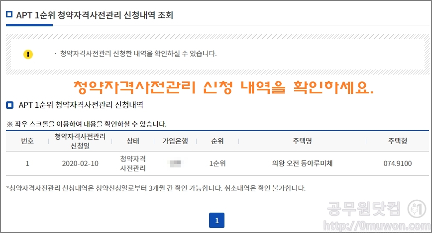 2. 청약자격사전관리 신청한 내역을 확인할 수 있습니다. 청약신청일로부터 3개월 간 확인이 가능합니다. 취소한 내역을 확인이 불가합니다.